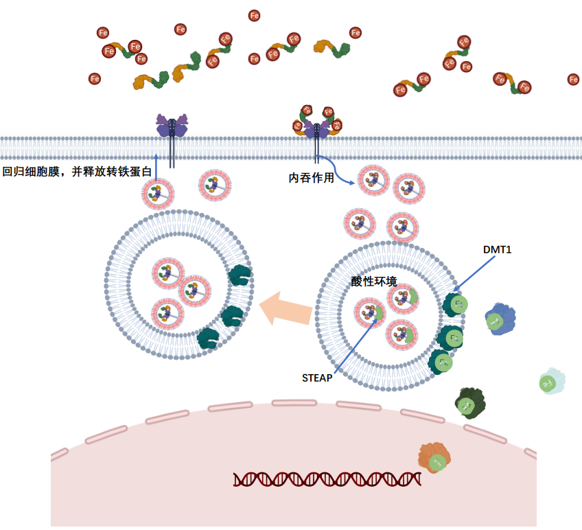 ? ? 轉(zhuǎn)鐵蛋白負(fù)責(zé)運(yùn)載由消化管吸收的鐵和由紅細(xì)胞降解釋放的鐵。以三價(jià)鐵復(fù)合物(TF-Fe3+)的形式進(jìn)入骨髓中,供成熟紅細(xì)胞的生成。轉(zhuǎn)鐵蛋白(TF)結(jié)合鐵是通過與其受體,即Transferrin Receptor 1(TFR1)相互作用而實(shí)現(xiàn)的。TFR1 是一種表達(dá)于細(xì)胞表面的糖蛋白,由兩個(gè)同源二聚體的亞基通過二硫鍵連接而成。在細(xì)胞表面,TF與Fe3+相互作用形成全鐵-TF,并與TFR1受體結(jié)合,在細(xì)胞內(nèi)吞作用下進(jìn)入核內(nèi)體。在偏酸性核內(nèi)體的環(huán)境中,F(xiàn)e3+與TF分離,同時(shí)前列腺蛋白(STEAP)將Fe3+還原為Fe2+,并被二價(jià)金屬離子轉(zhuǎn)運(yùn)蛋白1(DMT1)轉(zhuǎn)運(yùn)到細(xì)胞質(zhì)中,然后釋放了Fe3+的TF與TFR1組成TF/TFR1復(fù)合物,通過胞吐作用回游到細(xì)胞表面。在細(xì)胞表面,轉(zhuǎn)鐵蛋白(TF)與受體TFR1分離,成為脫鐵-TF,然后再與Fe3+重新結(jié)合參與鐵循環(huán)。整個(gè)過程完成后TF和TFR1被循環(huán)利用,進(jìn)入細(xì)胞攝取鐵的下一個(gè)周期中。