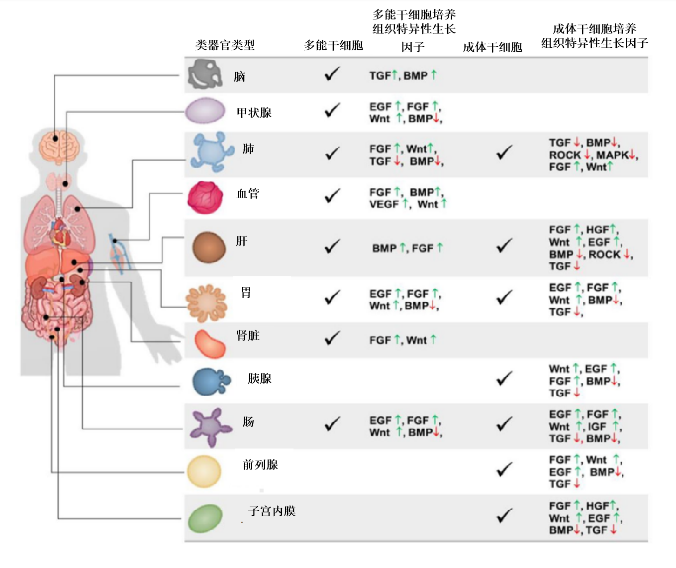 成功建立類(lèi)器官的關(guān)鍵,除了所需的生物材料基質(zhì)外,生長(zhǎng)因子作為細(xì)胞培養(yǎng)、增殖及分化所必需的物質(zhì)也必當(dāng)優(yōu)先考慮,從而保證類(lèi)器官中的干細(xì)胞長(zhǎng)期生存的能力。通過(guò)優(yōu)化培養(yǎng)物生長(zhǎng)條件模擬生理組織自我更新或損傷修復(fù)過(guò)程中的干細(xì)胞巢環(huán)境,如提供基底膜基質(zhì)(即Matrigengel)并添加一系列激動(dòng)劑(如Wnt和酪氨酸激酶受體)和抑制劑(如骨形態(tài)發(fā)生蛋白/轉(zhuǎn)化生長(zhǎng)因子-β)可達(dá)到上述目的。不同的生長(zhǎng)因子組合也能誘導(dǎo)多能干細(xì)胞向不同的類(lèi)器官細(xì)胞分化進(jìn)而獲得我們需要的類(lèi)器官類(lèi)型(圖1),同時(shí)不同的細(xì)胞因子也是培養(yǎng)不同種類(lèi)的類(lèi)器官的關(guān)鍵物質(zhì)(圖2)。